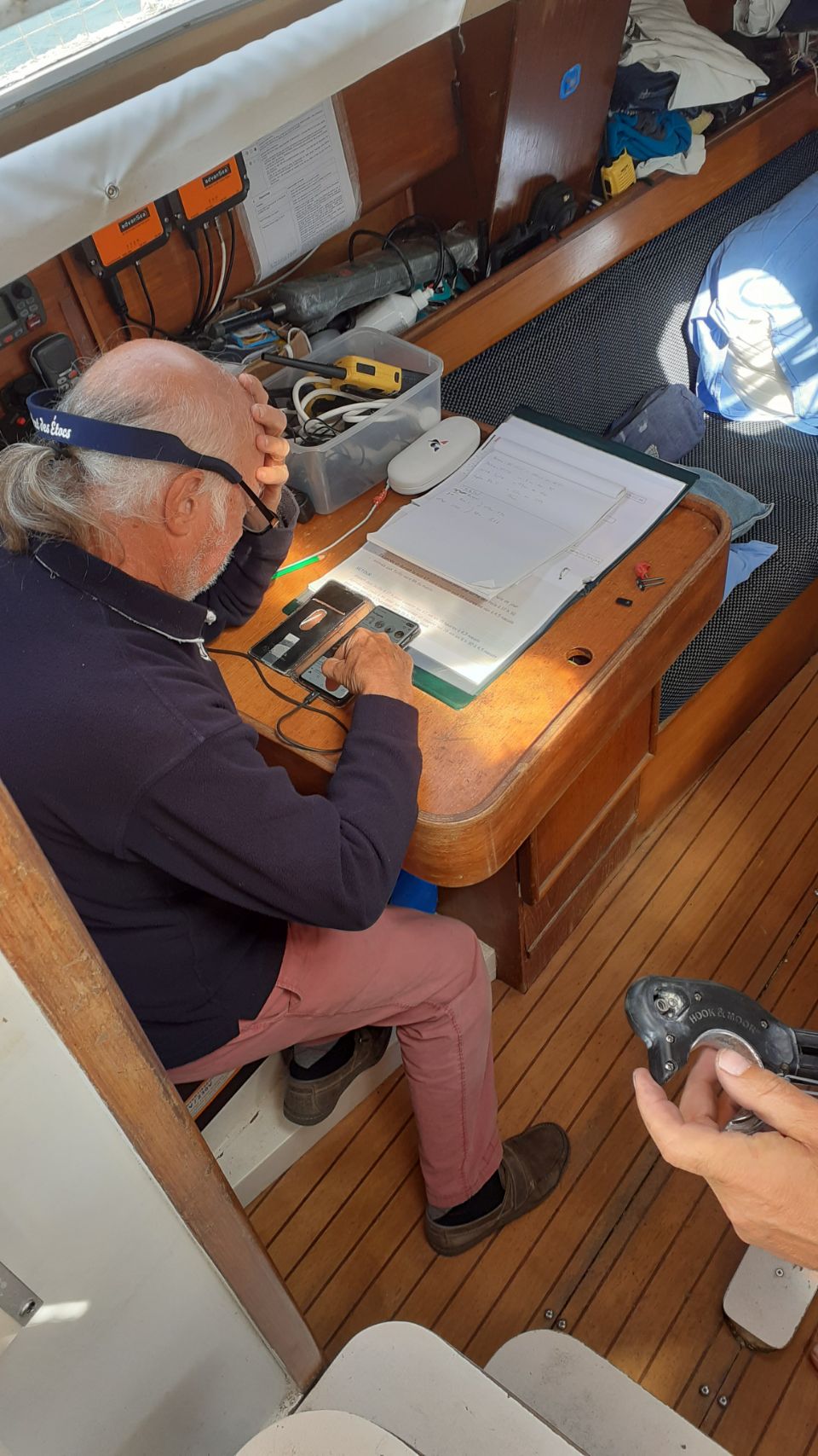 Derniers préparatifs … le sac de voyage est à bord, briefing de Michel sur les points et les procédures de sécurité ! Les quarts sont répartis … c’est tout bon !!! Puis le Django 7.70 de Christian et Marcel vient nous rejoindre pour charger ses affaires avant de repartir à sa bouée pour la nuit.