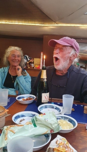 Puis un excellent resto « Chez Tonton » ou nous invitons à notre tour notre capitaine et toutes ses bougies. Nous repartons tranquillement vers ENWAEN pour aller dormir … mais … nous rencontrons Yann … un jeune qui connaît bien Michel et qui nous invite à venir visiter son voilier (un Comet de 11 mètres) Il vit sur ce bateau avec sa compagne et leur chat et font pour l’instant de petites virées avant de partir vers des destinations plus lointaines. Encore un bon moment de partage … minuit … allez demain c’est la dernière ligne droite avant Kérity.