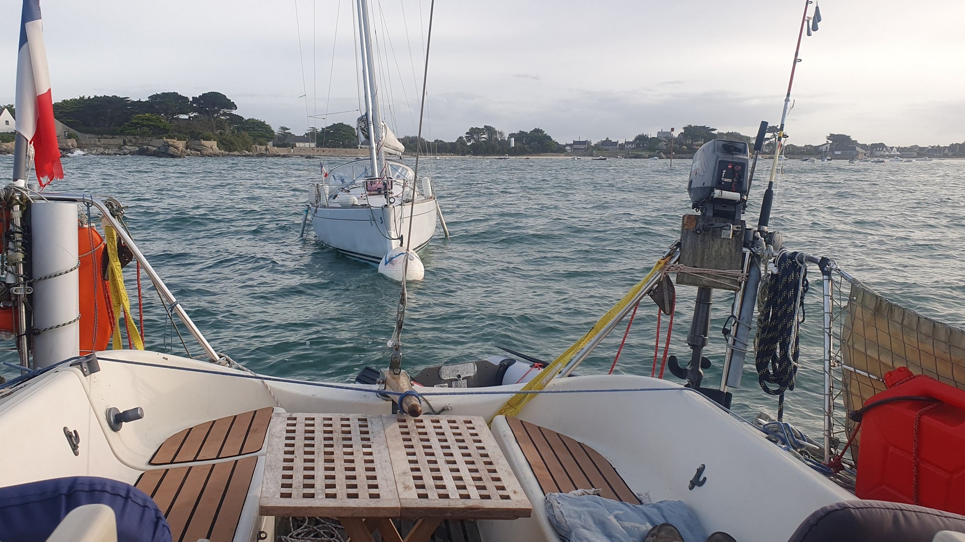 On arrive ensemble dans l’entrée du petit chenal qui mène au port de Ploumanac’h. On découvre que les bouées ne sont que par embossage et que dimanche la capitainerie ne répond pas. On cafouille un peu en cherchant la ligne d’embossage destinée aux visiteurs.