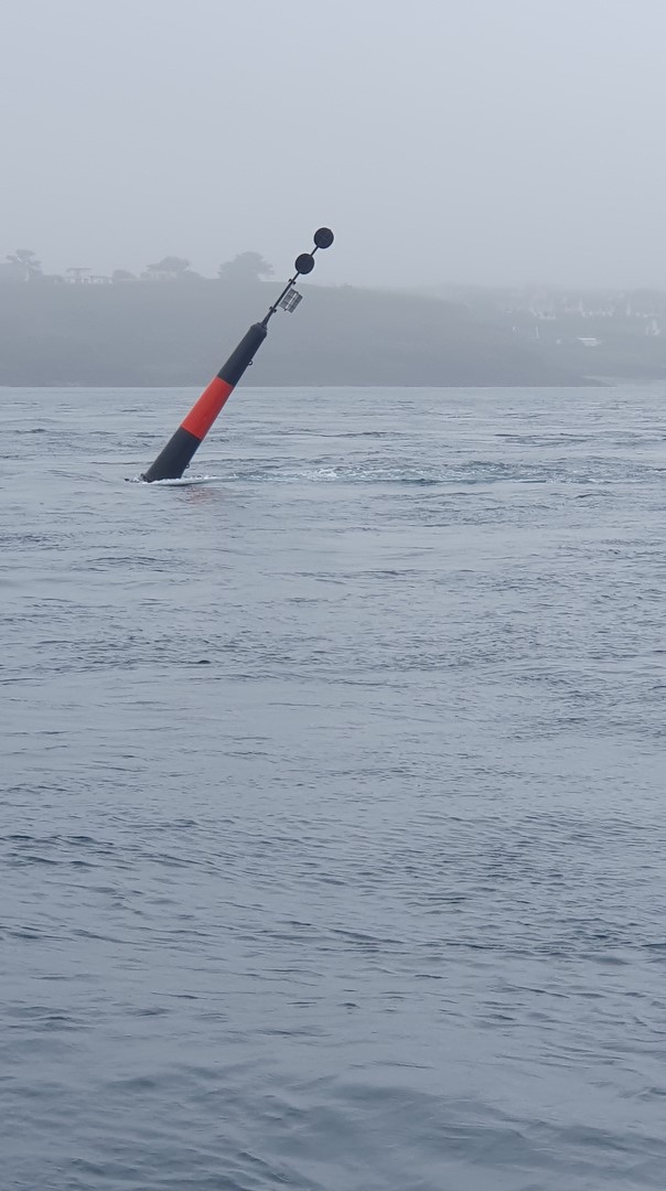 Départ à 9h45 pour pouvoir sortir avec un tirant d’eau suffisant. A cette occasion en passant près de la perche rouge on découvre l’échelle des hauteurs d’eau qu’on ne pouvait voir la veille à marée haute, celle-ci étant tronquée à 2m60, hauteur permettant à tous les bateaux de tirant d’eau inférieur à cette limite de pouvoir rentrer sans risque.