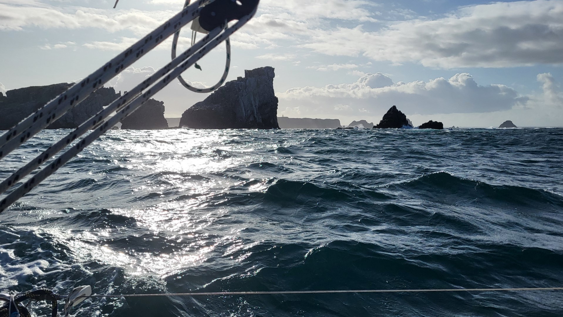 C’est bon on largue les amarres à 10h00 sous un ciel nuageux, température douce et dès le chenal le vent nous pousse au près à plus de 5 Nœuds. ENAWEN après la côte, prendra le large, BRIDAN reste sur l’autoguidage pour laisser sur bâbord l’ensemble des roches côtières. A noter le fort courant favorable qui va favoriser de belles vitesses autour des 6 à 8 nœuds.