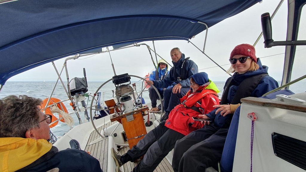 A 9h30 le moteur tourne c’est le départ direction le Crouesty. Tous les voyants sont au vert : du soleil, du vent travers, tournant grand largue puis arrière. Certains se régalent à la barre, je crois même qu’ils prennent goût à la barre à roue (il faut dire que celle-ci est parfaite)