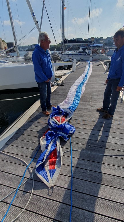 Il y a 12 milles nautiques à courir et le vent sera modéré. Le test du spi est dans les têtes depuis le départ de la croisière. Le spi est alors sorti de son sac sur le ponton (impressionnant avec plus de 15 mètres de long), on découvre la chaussette d’enroulement et on attache les 2 écoutes. Tout est remballé et on quitte Concarneau vers 11h00. Après de courts essais de voiles en ciseau, c’est le spi qui va assurer la vitesse avec un vent devenu mou. Malgré un défaut de montage du point d’amure, le spi et ses 130 m2 fait son office et permet des vitesses très honorables.