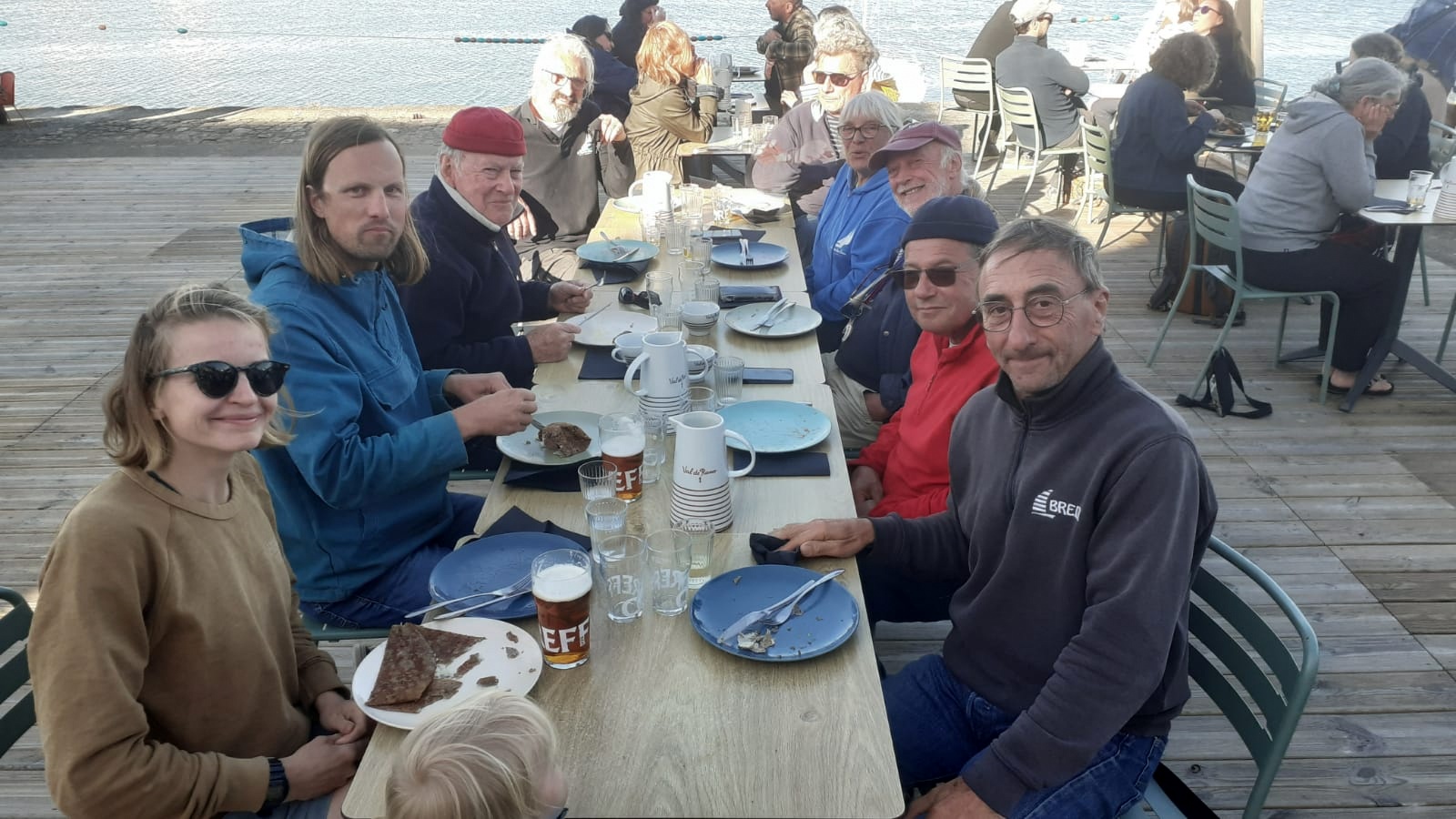 Apéro anniversaire plus ou moins SURPRISE sur ENAWAEN II pour fêter les 76 ans de notre Captain préféré Michel, avant d’aller tous ensemble diner à la crêperie de la marine.