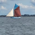 Je pars en solitaire pour un petit tour au-delà des Etocs. Le vent est donné pour un 4 Beaufort sur Marée Info, mais étant encore à la bouée la sensation est plus forte. Je prends 2 ris dans la GV. J’ai bien fait. Mon parcours de « challenge » Basse Nevez – Spineg – Raguen est un peu sportif et les 5 à 6 noeuds sont facilement atteints, ça me suffit. Pas seul sur ce plan d’eau, j’y ai aperçu Yves L sur son joli Côtre de Carantec, AR BARADOZ et comme souvent Pierre Yves et Xavier sur MARPLIJ. En rentrant, le chenal de Penarguer est agité, je mets le moteur en marche et arrive à la bouée pour un amarrage correctement exécuté.