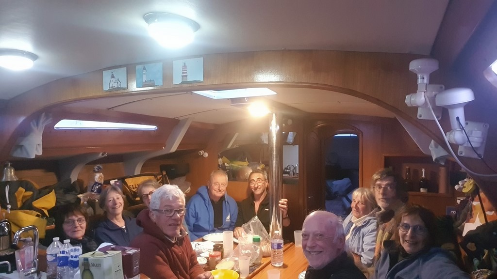 Lever 5h30 pour un départ à 7h00. Du bon vent au début en quittant Camaret jusqu’à la mi-journée. Du moteur ensuite pour croiser Pierre-Yves et son MARPLIJ venu nous accueillir au large de Men Hir et pour arriver à Loctudy à 18h00, accueilli royalement par moults adhérents, avec apéro et brins de muguet, délicate attention de la part de Rémy et Valérie.