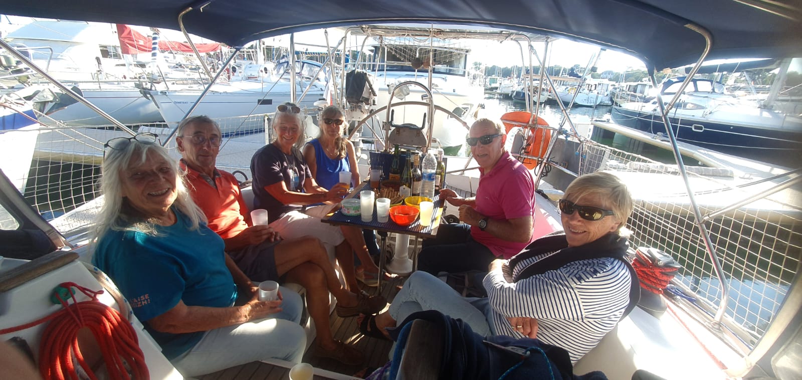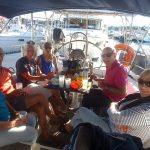 Toujours accompagné par une belle météo, le repas est pris en terrasse (autrement dit dans le cockpit) sur NOZ GWENN qui n’a jamais accueilli tant de monde.