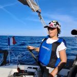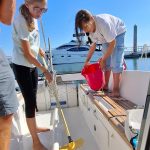 Le vent est assez soutenu il nous mène au près serré vers l’ouest des Moutons. Les 2 voiliers gîtent parfois fort, mais ça déménage avec du 5 nœuds quasi constant. Encore du près serré pour virer babord jusqu’à contourner La Pie et se diriger vers les bouées de St Nicolas. Il y a du monde sur l’eau mais on trouve facilement 2 anneaux vers 13h30. Chacun reste à son bord pour un déjeuner entre frugal et consistant, tout dépend du nombre de grosses tartines englouties.Evidemment Lucie et Louise n’ont qu’une hâte, c’est de plonger de la petite plage arrière de NOZ GWENN. Constat des plongeuses : elle est frrroide !